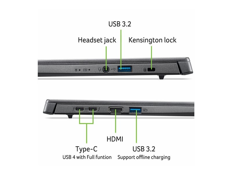 | Interfacedetaljer | 2 x USB4 (supports Thunderbolt 4, DisplayPort Alt Mode) (DC-In-kombo, Power Delivery) ¦ USB 3.2 Gen 1 (med strøm fra-opladning) ¦ USB 3.2 Gen 1 ¦ Kombostik til hovedtelefon/mikrofon ¦ HDMI |