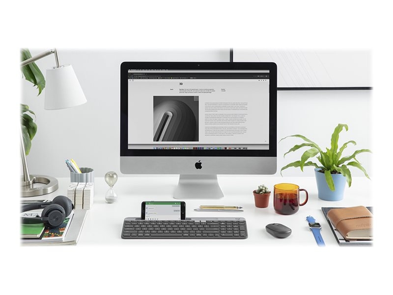 Det slanke, tjekkede K580-tastatur passer til flere typer enheder og vil pynte på ethvert skrivebord. Tastaturet kan både bruges til almindeligt tastaturarbejde foran computeren og til at skrive sms'er på din smartphone. Det perfekte redskab til moderne tider der kræver multitasking.